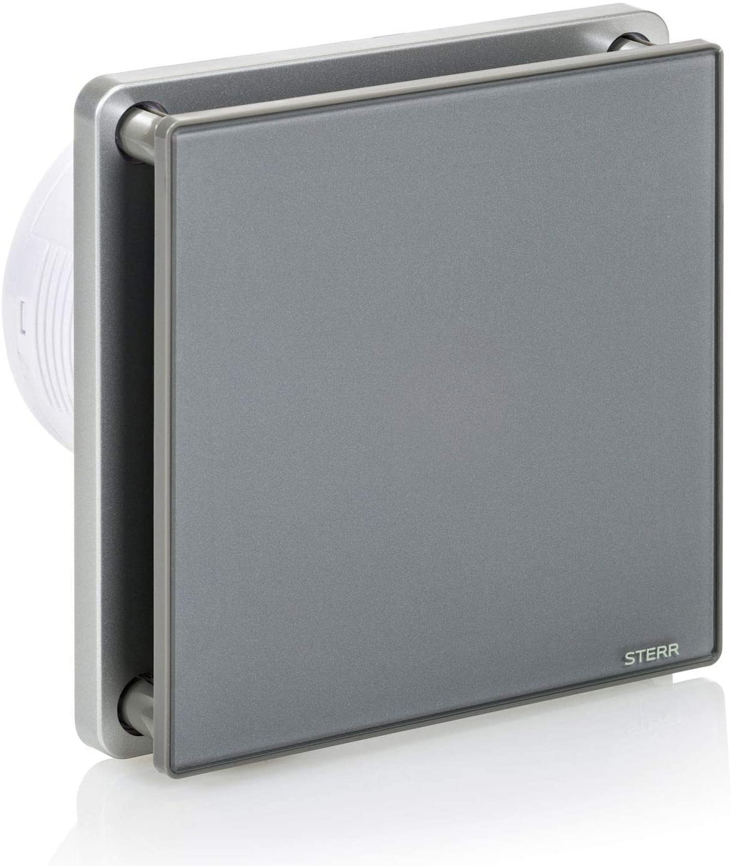 Badkamerafzuigventilator met glazen front, timer en intrekklep. Elegante en moderne uitstraling.