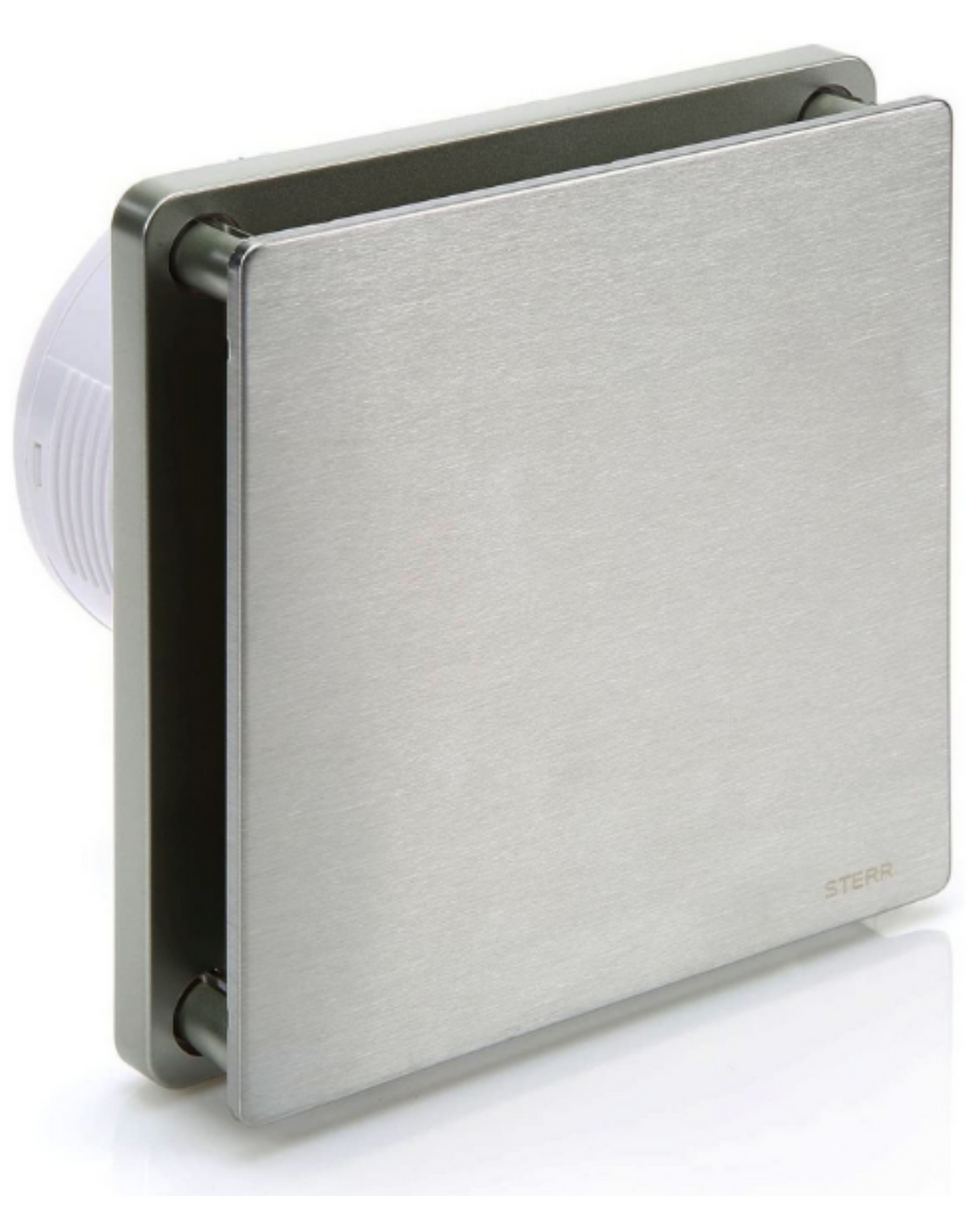 Badkamerafzuigventilator met timer, zilverkleurig roestvrijstalen frontpaneel en intrekklep. Strakke en moderne uitstraling.